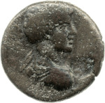 Zeus seated left, holding Nike on right extended hand, left hand resting on sceptre; at feet, to left, eagle