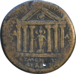 temple with six columns enclosing cult statue of Artemis of Ephesus standing facing, wearing kalathos, with supports |