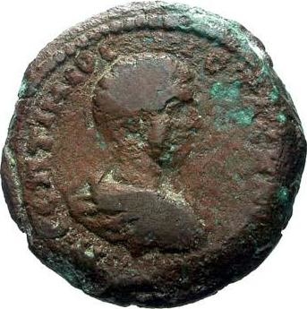 bare-headed, draped and cuirassed bust of Geta, right, seen from rear
