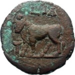 Apis bull standing, sun disc between the horns, left; altar before