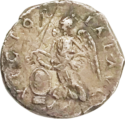 Victory advancing left, holding in both hands wreath over round shield set on low base