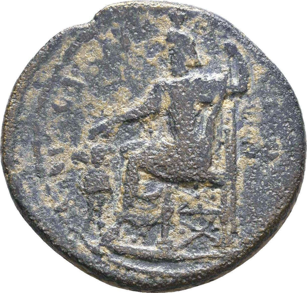 Sarapis seated on throne, left, his right hand extended over Cerberus standing at his side, his left resting on sceptre |