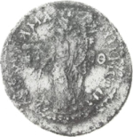 Tyche standing facing head left holding rudder in right and cornucopia in left |