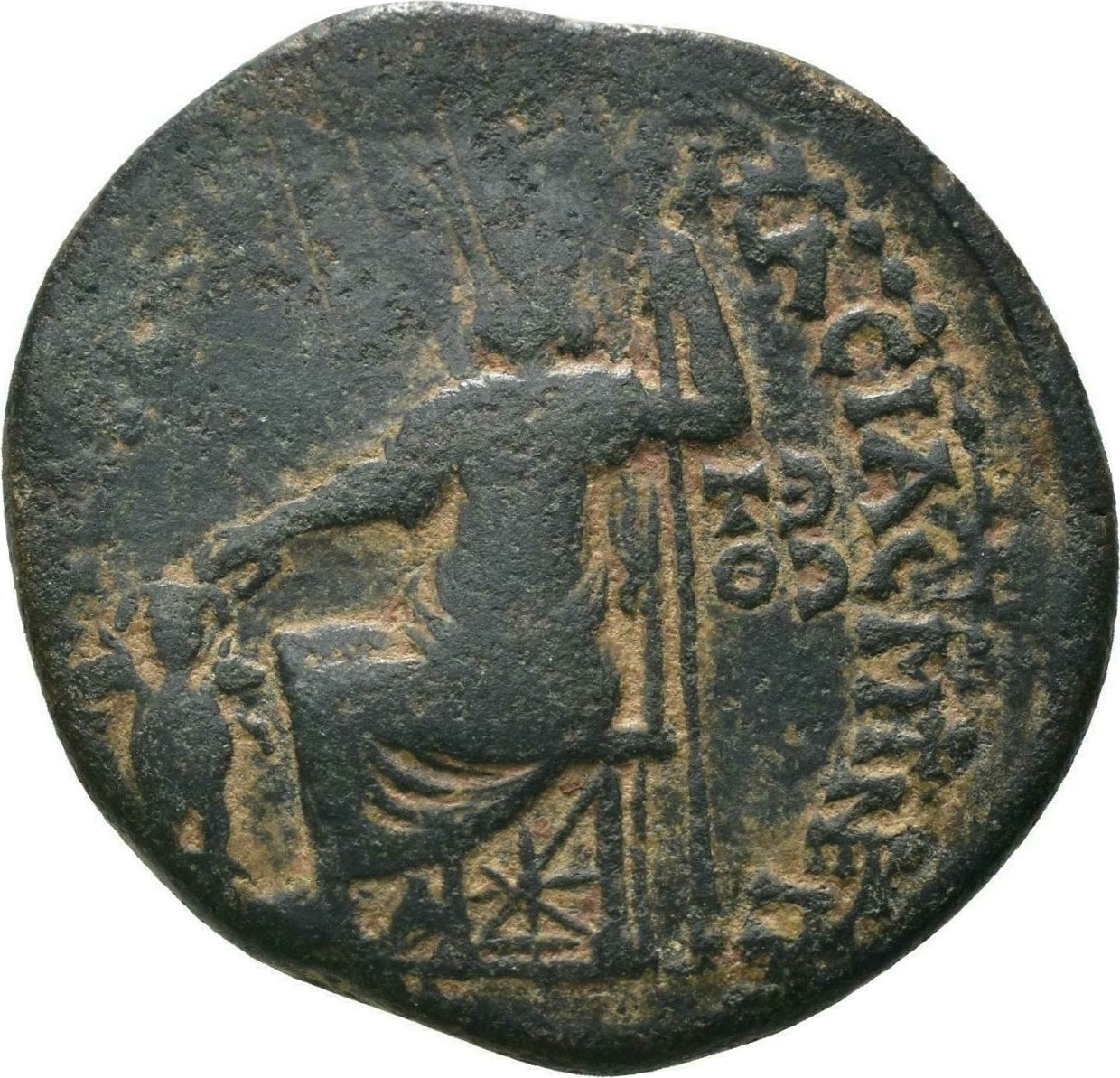 Sarapis seated on throne, left, his right hand extended over Cerberus standing at his side, his left resting on sceptre; in field, left, star |