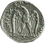 eagle standing on filleted thyrsus, facing, head and tail left, with wings spread, wreath in beak; on the right, wine jug