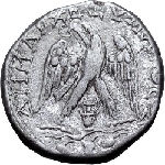 eagle standing on vine branch, facing, head and tail left, with wings spread, wreath in beak; wine jug between legs