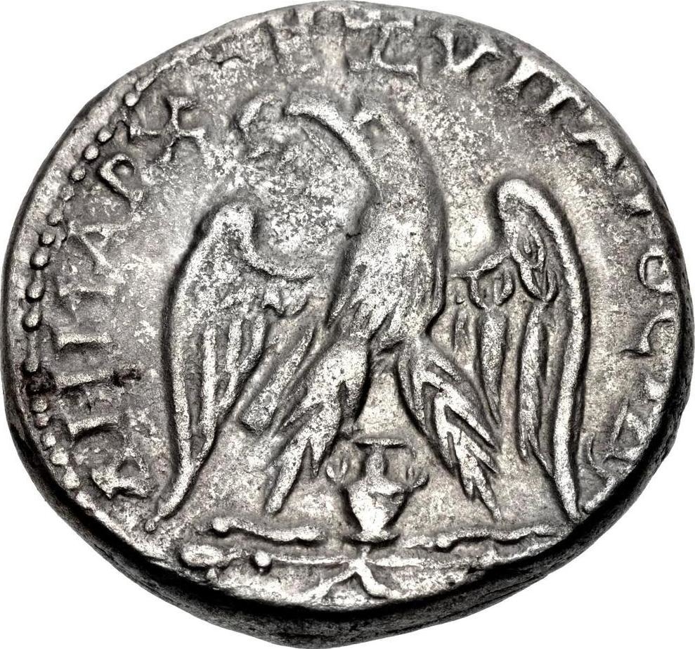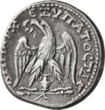 eagle standing on filleted thyrsus, facing, head and tail left, with wings spread, wreath in beak; wine jug between legs; on the right, grape