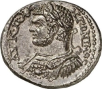 laureate and cuirassed bust of Caracalla, left, seen from front, with gorgoneion on cuirass and trabea over left shoulder