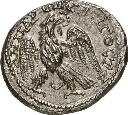 eagle standing facing, head and tail right, with wings spread, holding wreath in beak; between legs, bull's horns