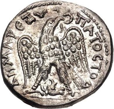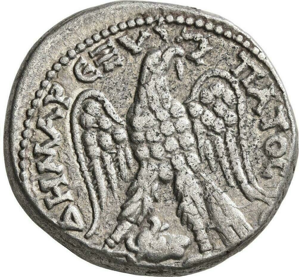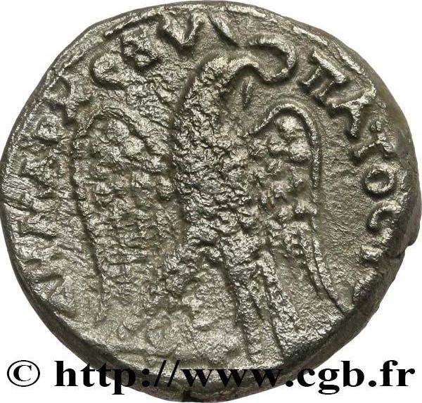 eagle standing facing, head and tail right, with wings spread, holding wreath in beak; between legs, bull's head right
