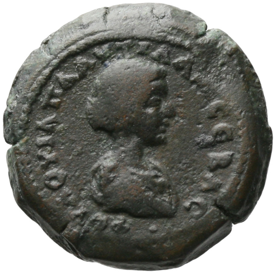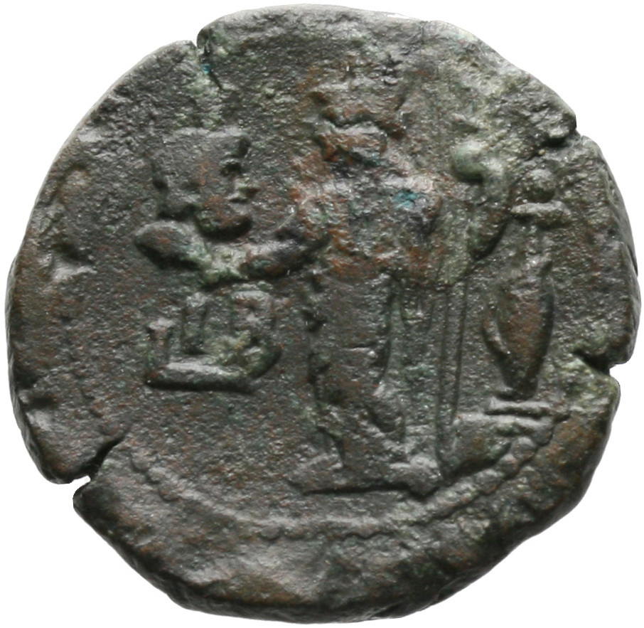 Alexandria standing facing, head left, holding vexillum and bust of Sarapis, in field vase