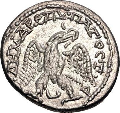 eagle standing facing, head and tail right, with wings spread, holding wreath in beak; between legs, bull's horns right