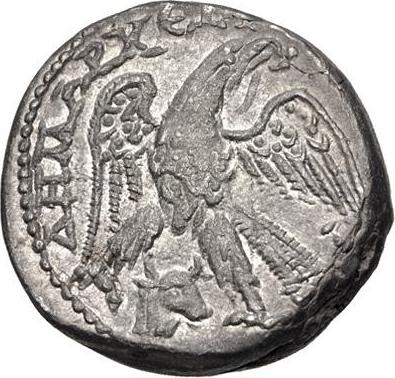 eagle standing facing, head and tail right, with wings spread, holding wreath in beak; between legs, bull's head right