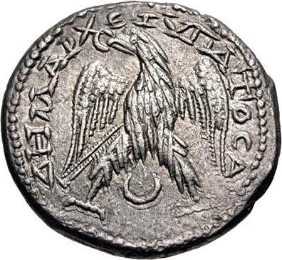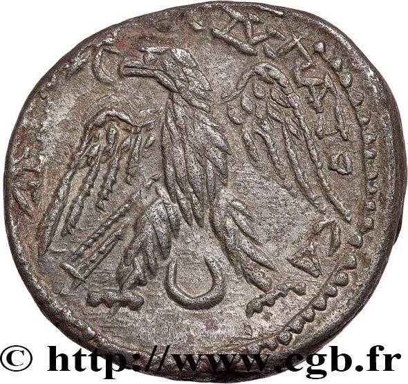 eagle standing facing, head and tail left, with wings spread, holding wreath in beak; between legs, bull's horns