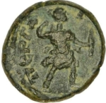 Artemis advancing right, drawing arrow from quiver at shoulder and holding bow