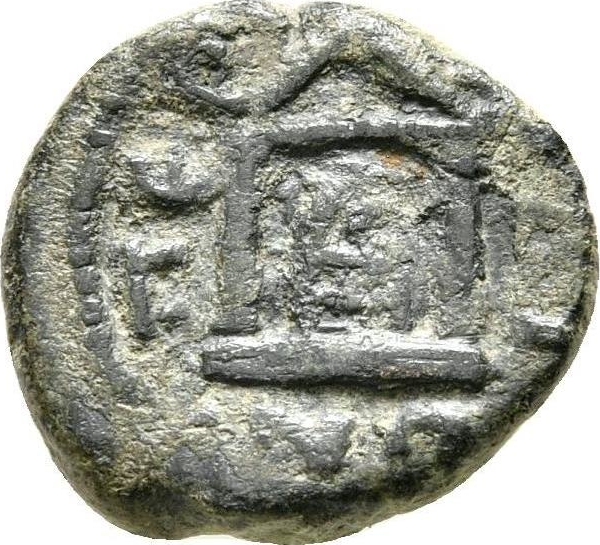 temple with two columns enclosing cult statue of Artemis Pergaia between star and crescent and flanked by two short columns surmounted by sphinxes; eagle in pediment