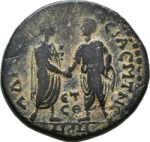 Caracalla and Geta in toga standing looking at each other, clasping right hands; in left field, star |