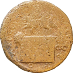 high altar surmounted by facing quadriga of Helios; to left, tree |
