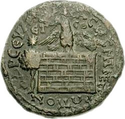 high altar surmounted by eagle standing facing, wings spread, wreath in beak (?), head right; to left, tree; in field, star |