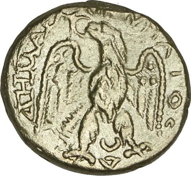 eagle standing facing, head and tail left, with wings spread, holding wreath in beak; between legs, bull's horns