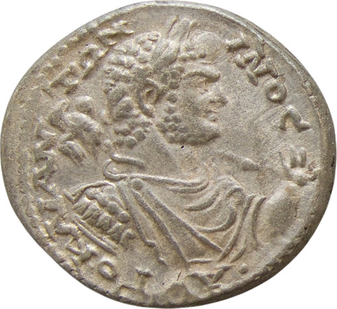 laureate, draped and cuirassed bust of Caracalla, right, seen from front, left hand holding eagle-tipped scepter over left shoulder