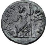 Zeus seated left, holding thunderbolt over eagle and sceptre; to right, Nike flying