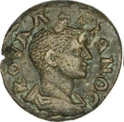 bare-headed, draped and cuirassed bust of Valerian II, right, seen from rear right