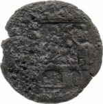 five deities reclining on a lectisternium; from right to left: Sarapis seated left, holding wreath on Harpocrates seated left before him; before, Isis seated right with headdress, holding sceptre and uraeus; behind her, Demeter seated right with kalathos and torch; far to left, Hermanubis holding caduceus, seated right; beneath the kline, in three niches: on each side, a standing figure with sceptre(?), in the middle, Tyche lies left on lectisternium, holding rudder and propping up head |