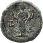 Homonoia standing facing, head left, raising right hand and holding double cornucopia
