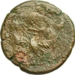 eagle standing facing, head left (?), wings open, above head of Zeus right
