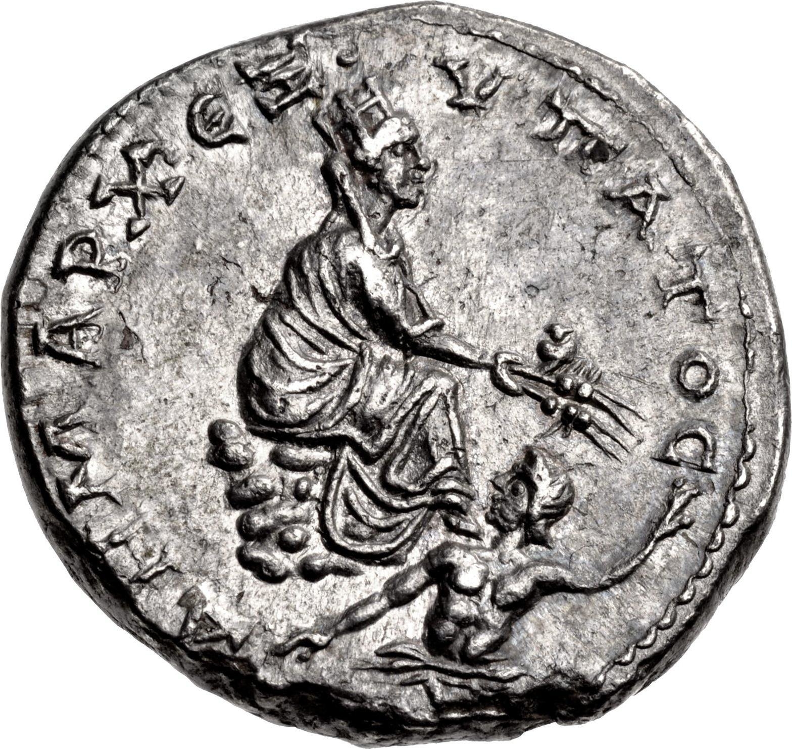 Tyche of Antioch seated on rocks, right, holding in her right hand two ears of wheat and poppy-head; at her feet, river god Orontes swimming right, looking left
