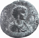 bare-headed, draped and cuirassed bust of Geta, right, seen from front