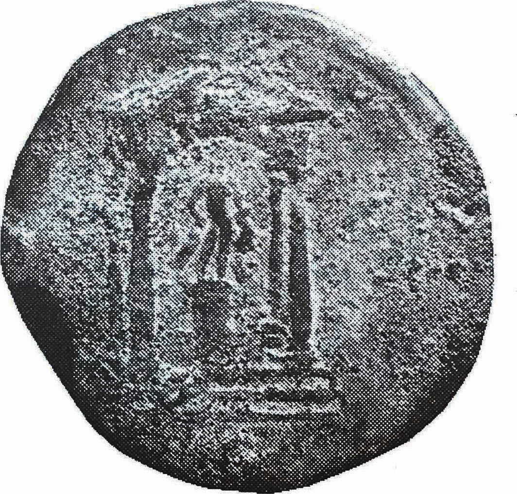 statue of Heracles nude standing facing resting on club with his right hand, holding lion skin on his left arm on pedestal within domed shrine with four columns