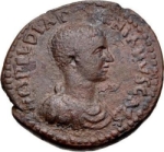 bare-headed and cuirassed bust of Diadumenian, right, seen from front