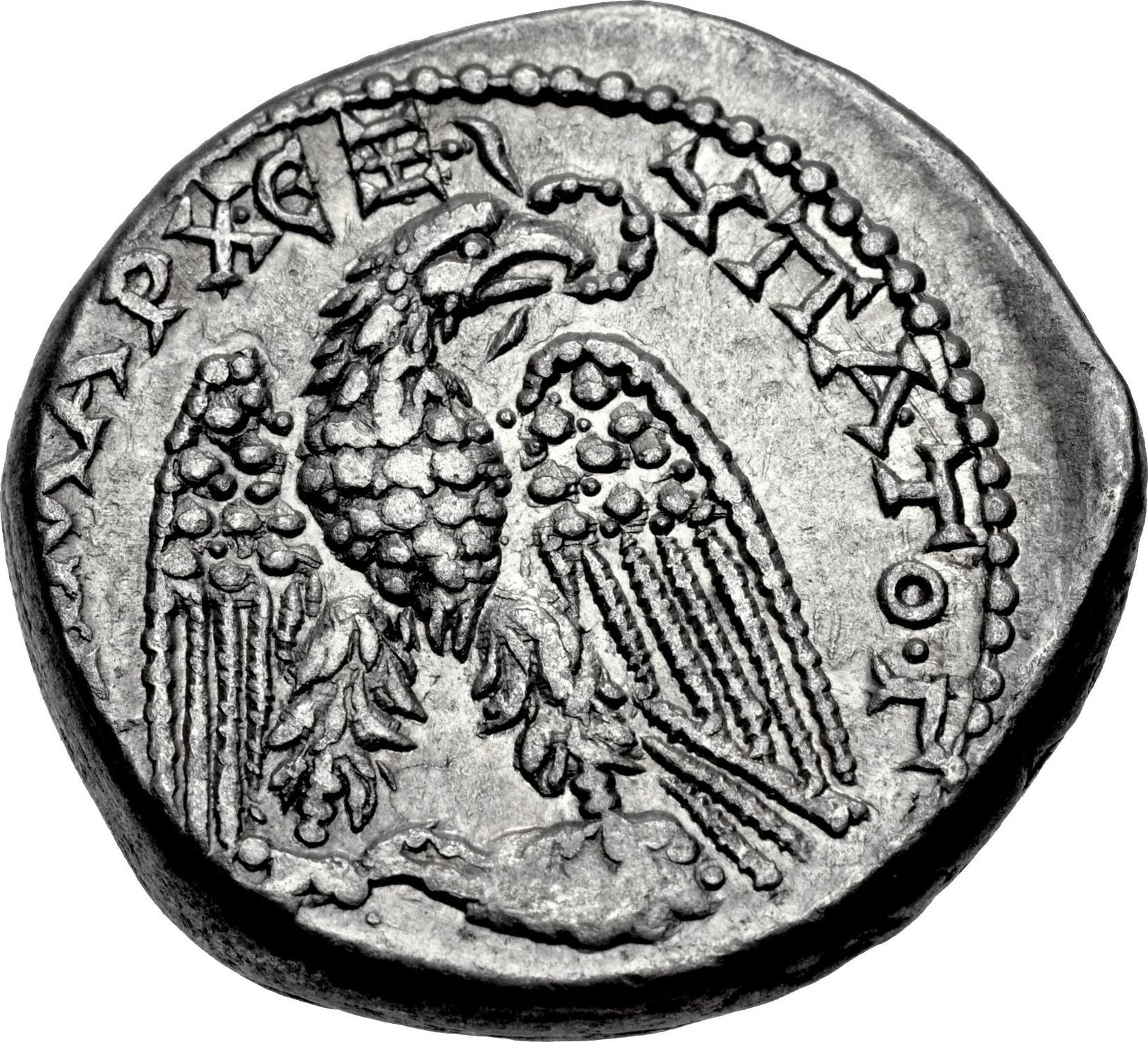 eagle standing facing, wings spread, head right, wreath in beak, standing on leg and thigh of sacrificial animal