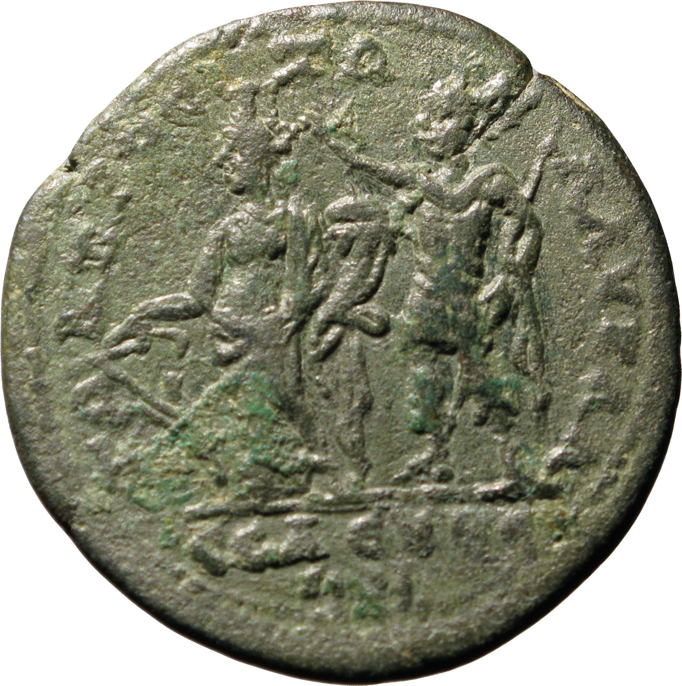 Tyche standing left, holding rudder and cornucopia crowned by Macrinus standing left, holding spear