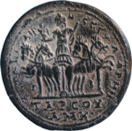 Caracalla standing facing, head left, in facing quadriga, holding Nike and parazonium |