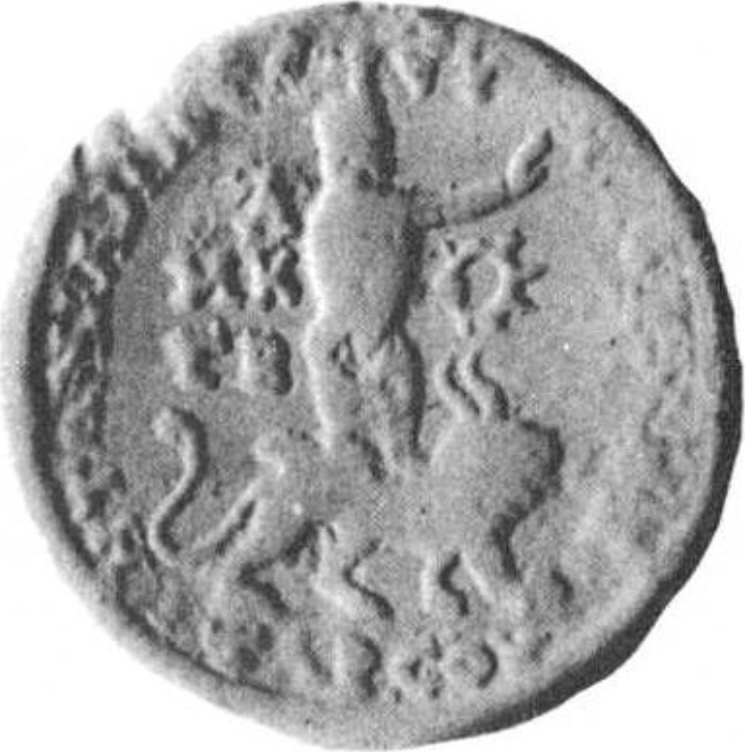 Sandan standing right, on horned lion, quiver over shoulder, raising hand and holding crown |