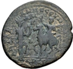Tyche standing right, holding Cilicarch crown facing Caracalla on horseback, riding left, raising han |