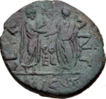 Caracalla and Geta, each togate, standing vis-à-vis, clasping right hands |