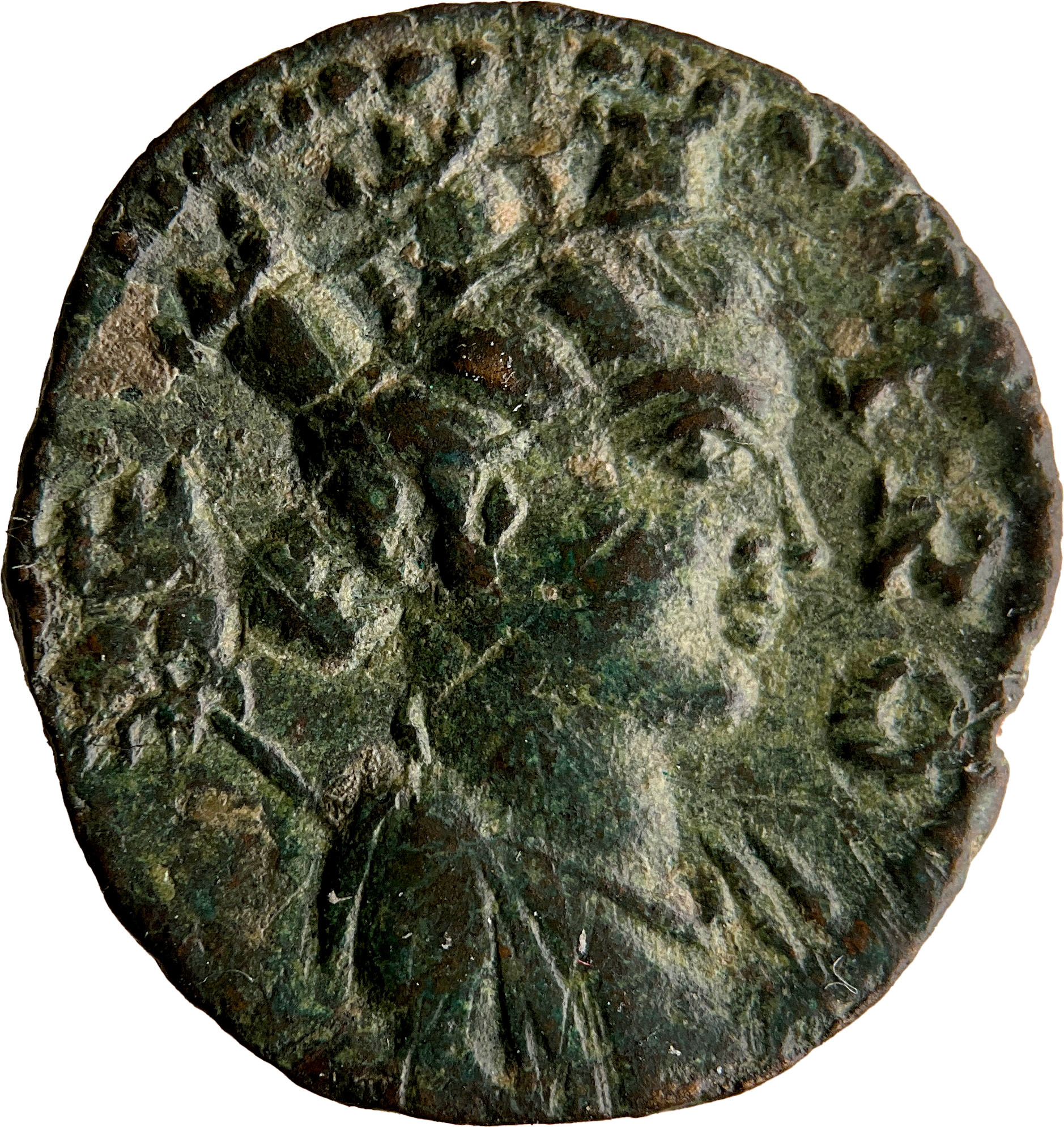turreted, draped and cuirassed bust of Tyche with vexillum, right |