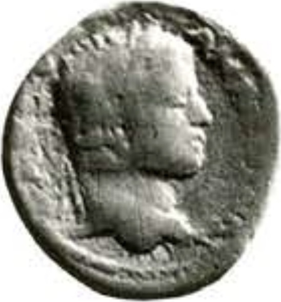 bust of Dionysus, right, crowned with ivy leaf, with thyrsus over left shoulder.; in front, bunch of grapes