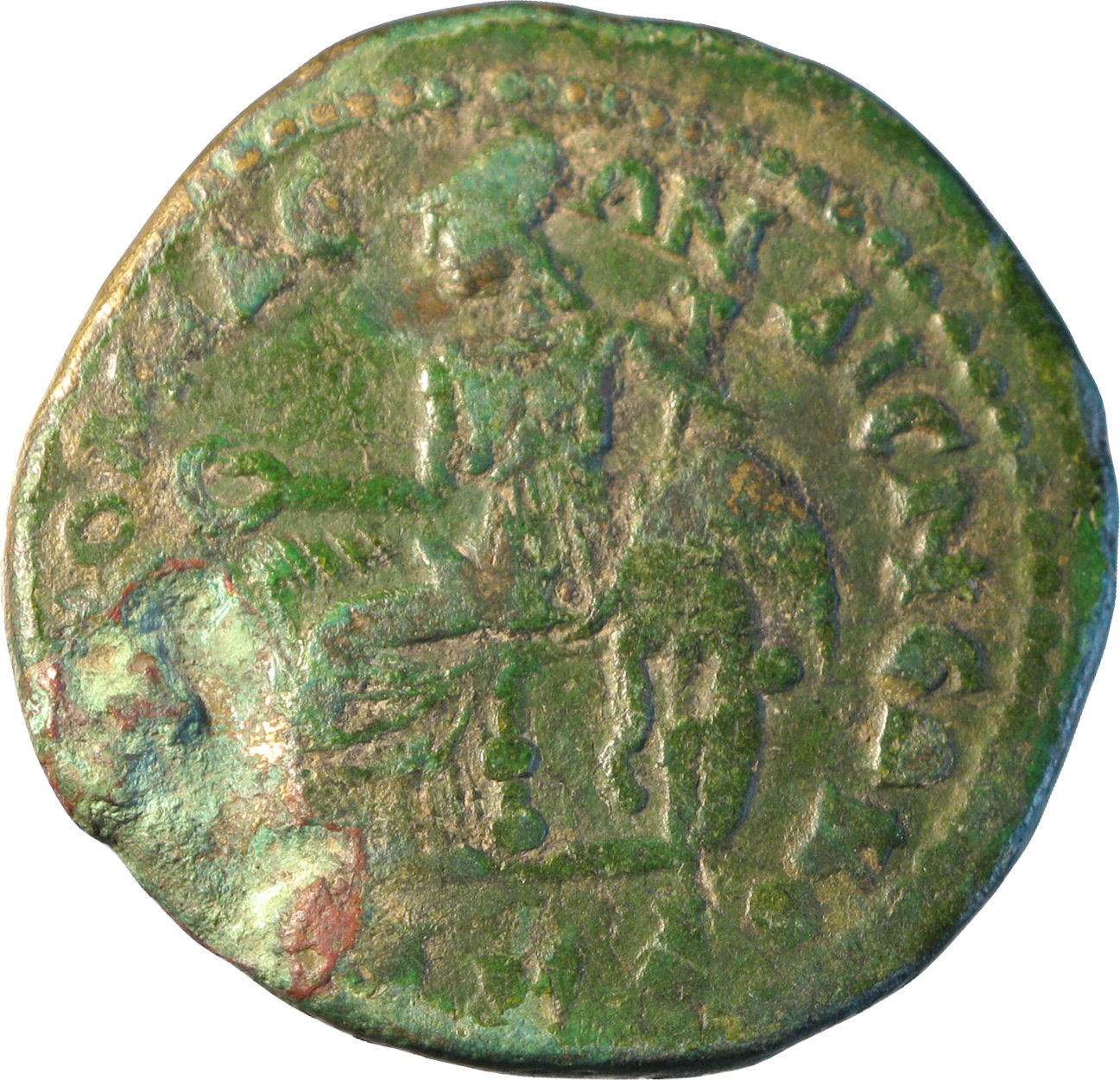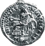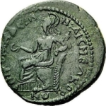 Athena seated left, holding patera in her right hand and parazonium in her left