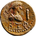 draped and diademed bust of Rhescuporis V, right; before, trident
