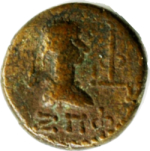 laureate and draped bust of Roman emperor, right; to right, tamgha