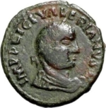 Obverse design laureate, draped and cuirassed bust of Valerian, right, seen from front
