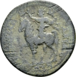 radiate god or hero riding left on horseback, raising hand and holding bow