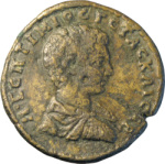 bare-headed, draped and cuirassed bust of Geta, right, seen from rear