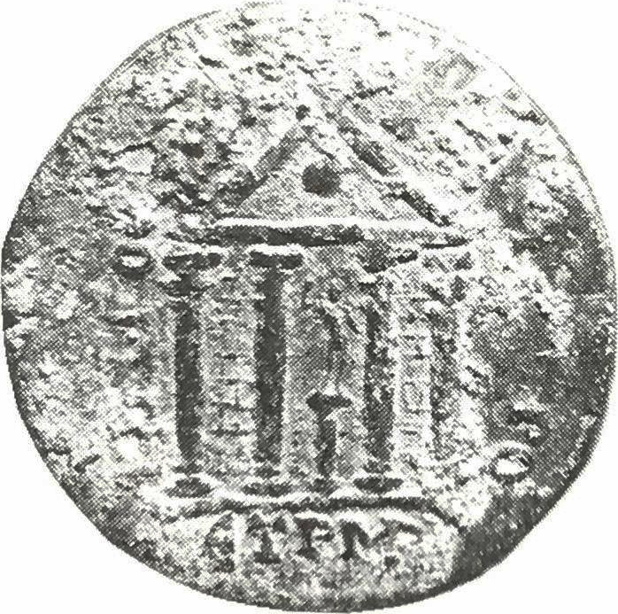 temple with four columns with wall within intercolumnations within which male figure on pedestal standing facing, head right, resting on sceptre; pellet in pediment |