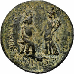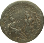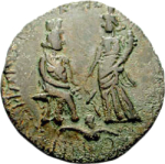 the Tyche of Diocaesarea seated right, on cubic chair, holding ears of corn and resting foot on swimming river god, facing the Tyche of Olba standing left, holding rudder and cornucopia